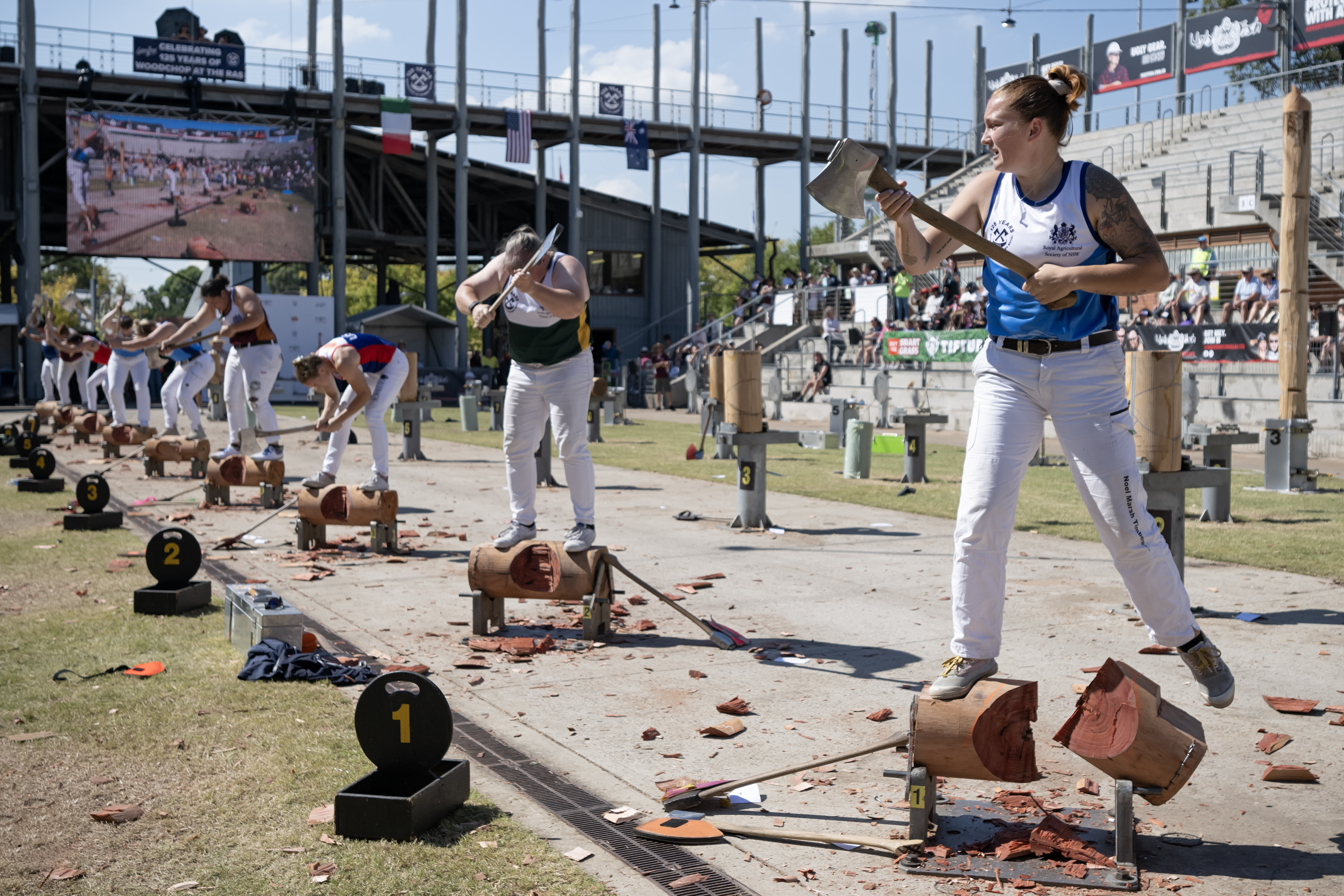 SAWING: In double-handed or single-handed sawing events, competitors race to saw through a block. They compete individually or as a pair.